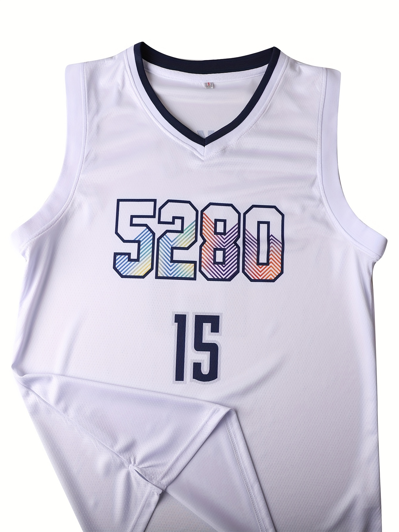 Men's #15 White Basketball Jersey - V-Neck, Breathable Polyester, "5280" and "15" Numbers, Sporty Sleeveless Top for Training & Competition, Sizes S-XXXL, Sports Jersey|Vneck Jersey|Polyester Fabric