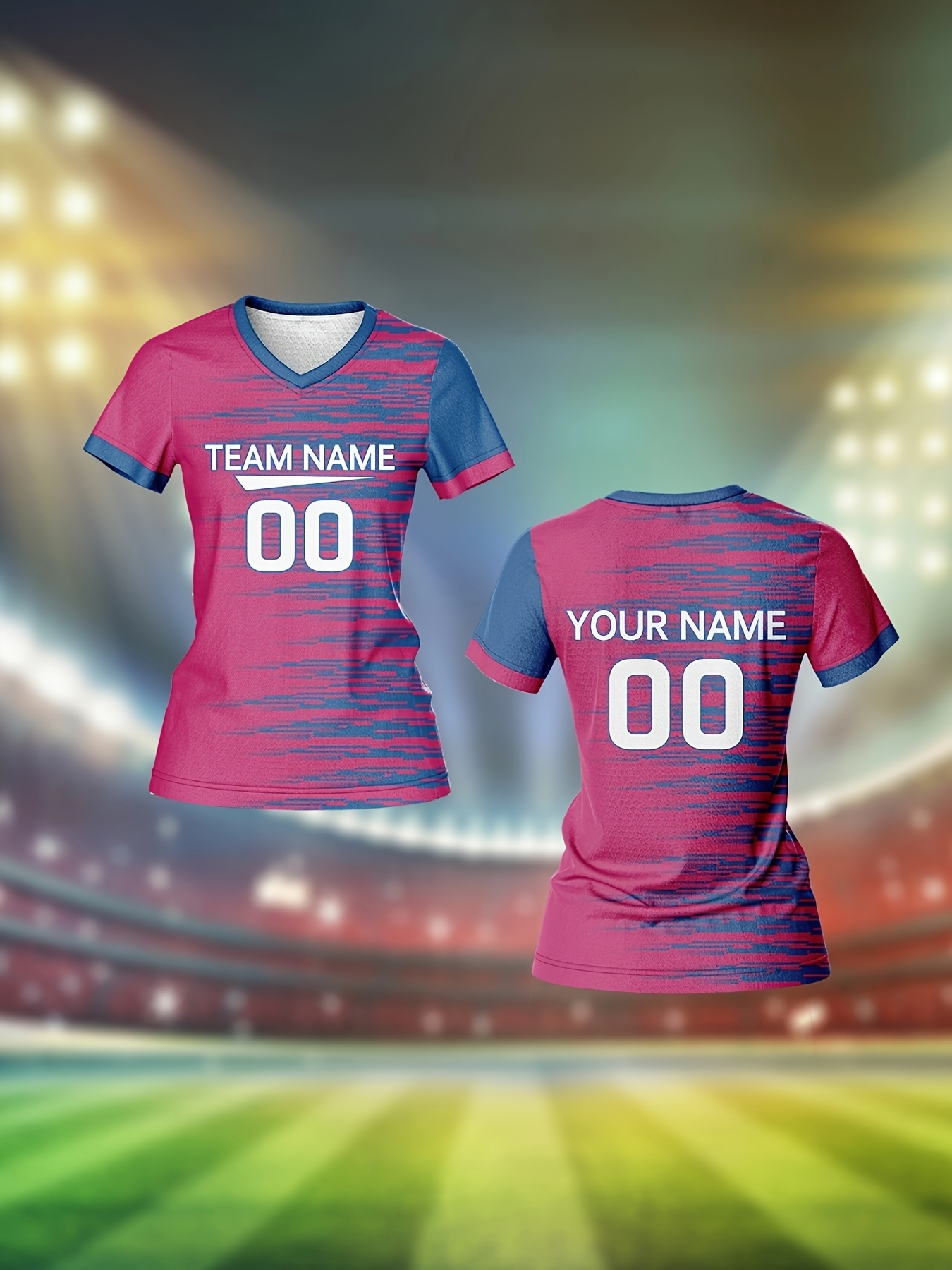 [Quick-Dry Soccer Jersey] Breathable Quick-Dry Custom Women's V-Neck Soccer Jersey | Personalized Name & Number, Pink with Blue Stripes for Team Training, Sports Fitness, and Casual Wear