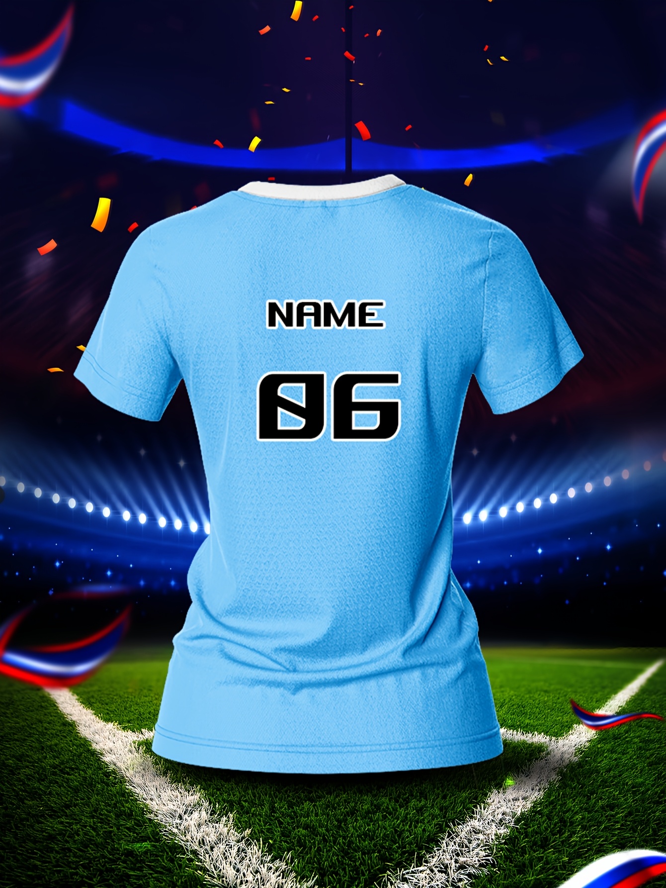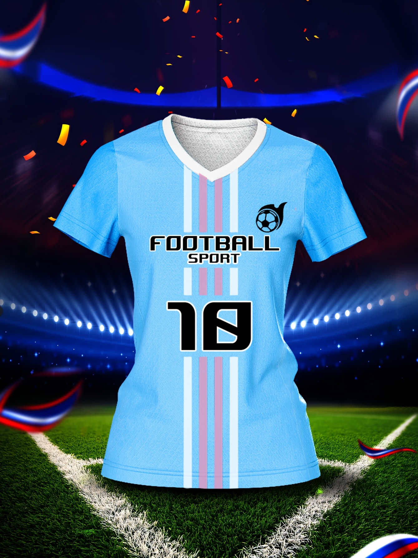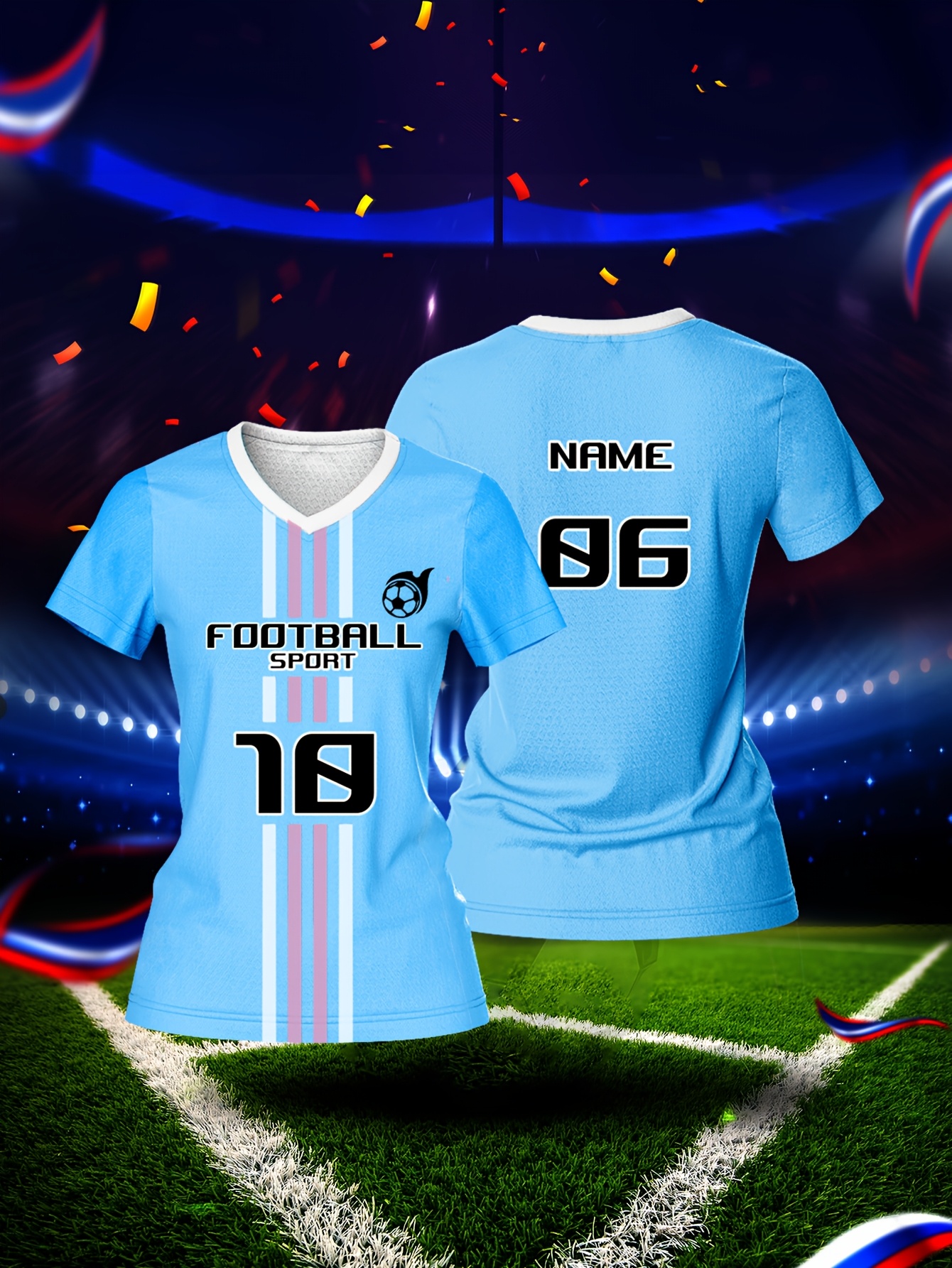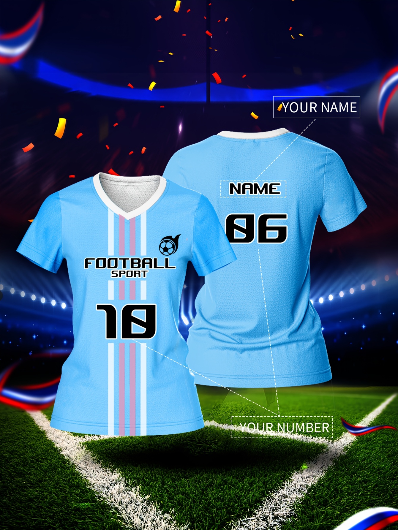 Customizable Women's V-Neck Football Jersey - Personal Name & Number, Breathable Polyester, Quick-Dry Sports Top for Team Training & Casual Wear, Blue with Striped Accents